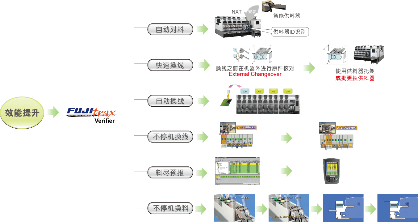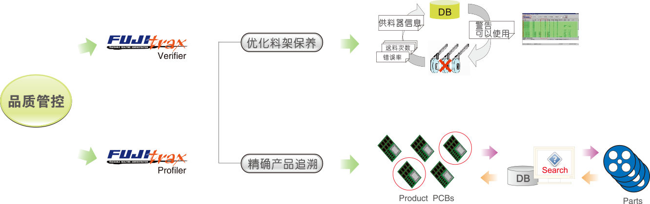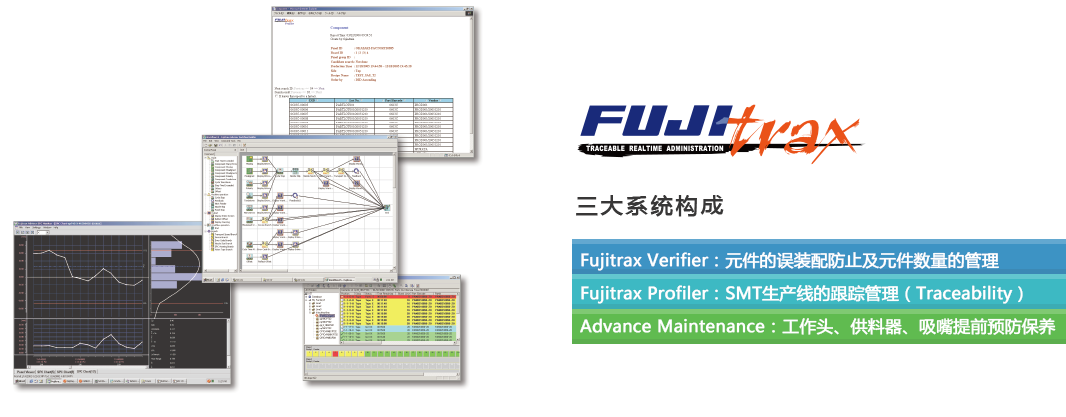 Fujitrax實(shí)時(shí)收集,分析生產(chǎn)狀況,促進(jìn)快速動(dòng)作,進(jìn)行機(jī)器管理及元件、供料器管理、換線支援等,實(shí)現(xiàn)了貼裝生產(chǎn)線的高品質(zhì)、高效率運(yùn)用。