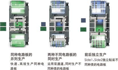 此外,雙搬運(yùn)軌道軌道規(guī)格機(jī)還可以同時(shí)進(jìn)行2個(gè)電路板種類(lèi)的平行生產(chǎn),可以大范圍地對(duì)應(yīng)各種電路板尺寸和生產(chǎn)方法
